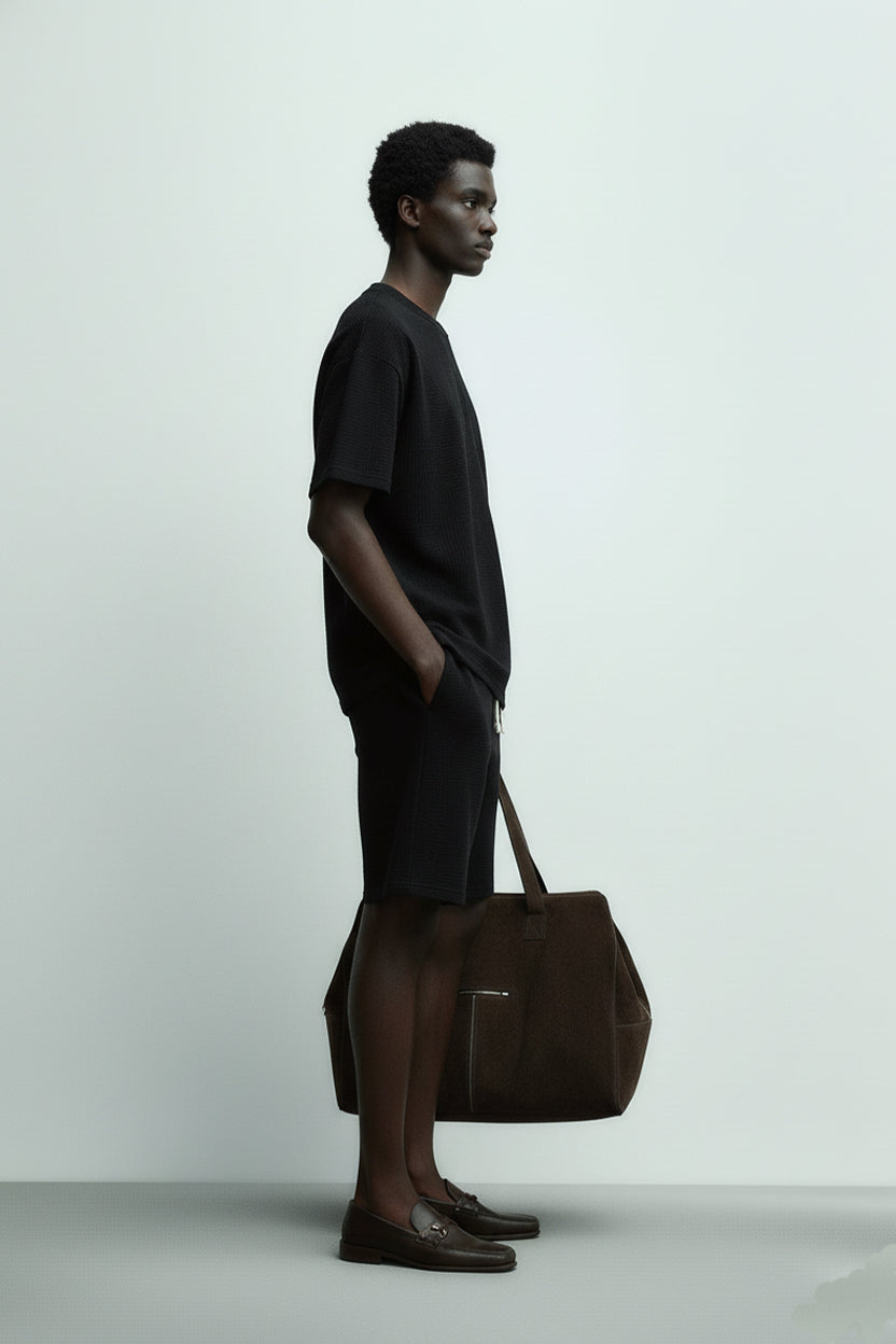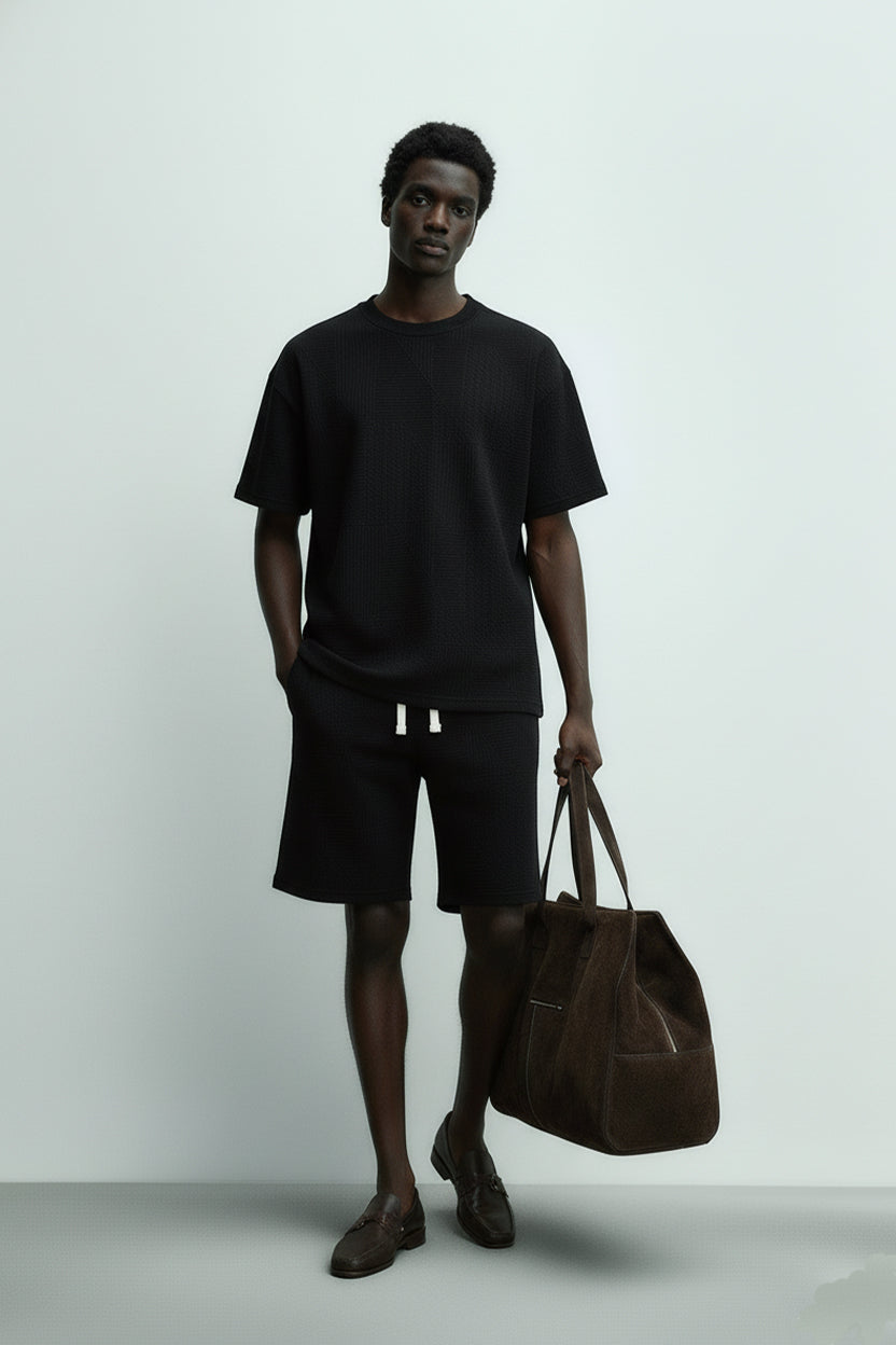 Men's Short Sleeve Textured T-Shirt & Shorts (Black)
